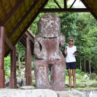 Le site archéologique de Utukua lui, dans la vallée de Punaei, abrite le "tiki souriant" en pleine forêt tropicale, sur un ancien espace de fête Tohua et d’un me’ae (marae). C’est l’un des rares tikis connus en Polynésie avec cette expression. (On y a pas vue de banian) Haut de moins d'un métre, il sort difficilement de la végétation avec les arbres gigantesques autours. Sa tête qui se bidonne avec ses grandes lunettes semble couverte d’un bonnet. Les mains sont placées sur le ventre de chaque côté d’un nombril bien visible. Cool quoi !